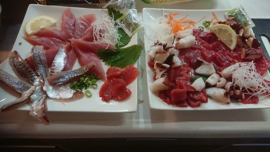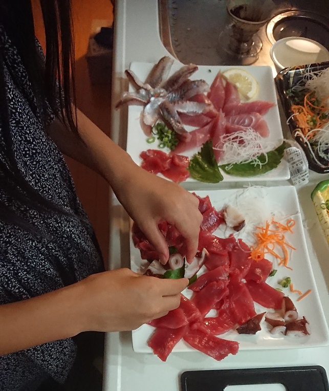 #5 お刺身盛り付け 2022.09.26 まずは、お魚を切って~ マグロ アジ たこ 色んなお魚を切ってるよ~ さ~て盛り付けましょう お花みたいにお盛り付けました。 どうでしょう? かわいいでしょう? かんせ~い!